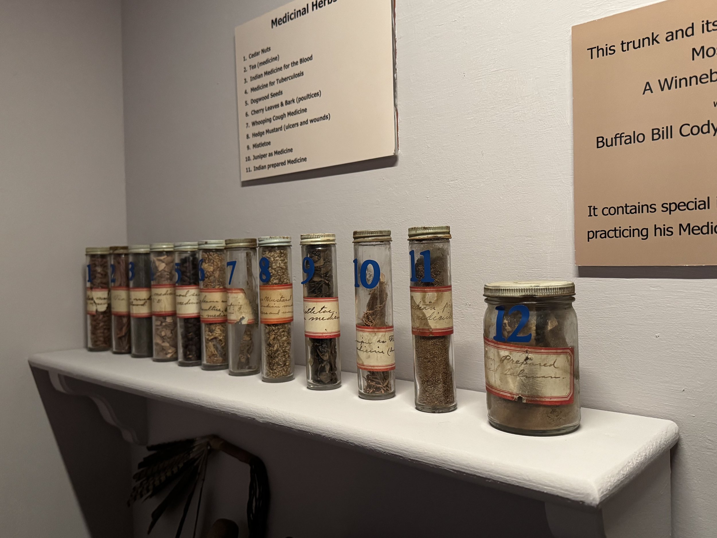 The trunk contains two levels filled with glass containers that hold all kinds of herbs, minerals, and the tools needed to make medicine or treatments. Native American healing traditions have long been believed to address a wide range of health issues, including heart disease, diabetes, and even cancer. Medicine Men weren’t just healers—they also served as spiritual leaders in their communities. Pictured below are several of the herbs found in the trunk, along with other essential items that were used.